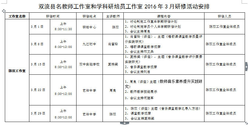 双流县名教师(陈双)工作室2016年3月研修活动安排