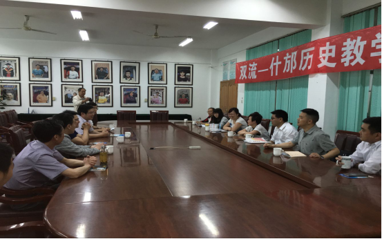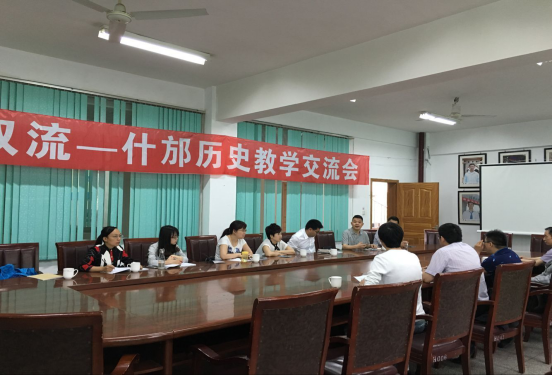在参观完了校园之后,工作室成员跟随着什邡中学的历史老师一起来到了会议室进行历史教学的交流。交流会议一开始,什邡中学的校长李长露致词表示对工作室成员的欢迎。随后什邡中学的招生办主任向我们介绍了什邡中学。什邡中学是四川省国家级示范性普通高中,办学历史悠久,高考成绩斐然,多位学子考入北大清华。什邡中学的历史学科也是非常的强大,其历史教研组长刘鑫还成立了德阳市名教师工作室,刘鑫老师所任教的班级在在2014年全省高考历史万分之一中脱颖而出。