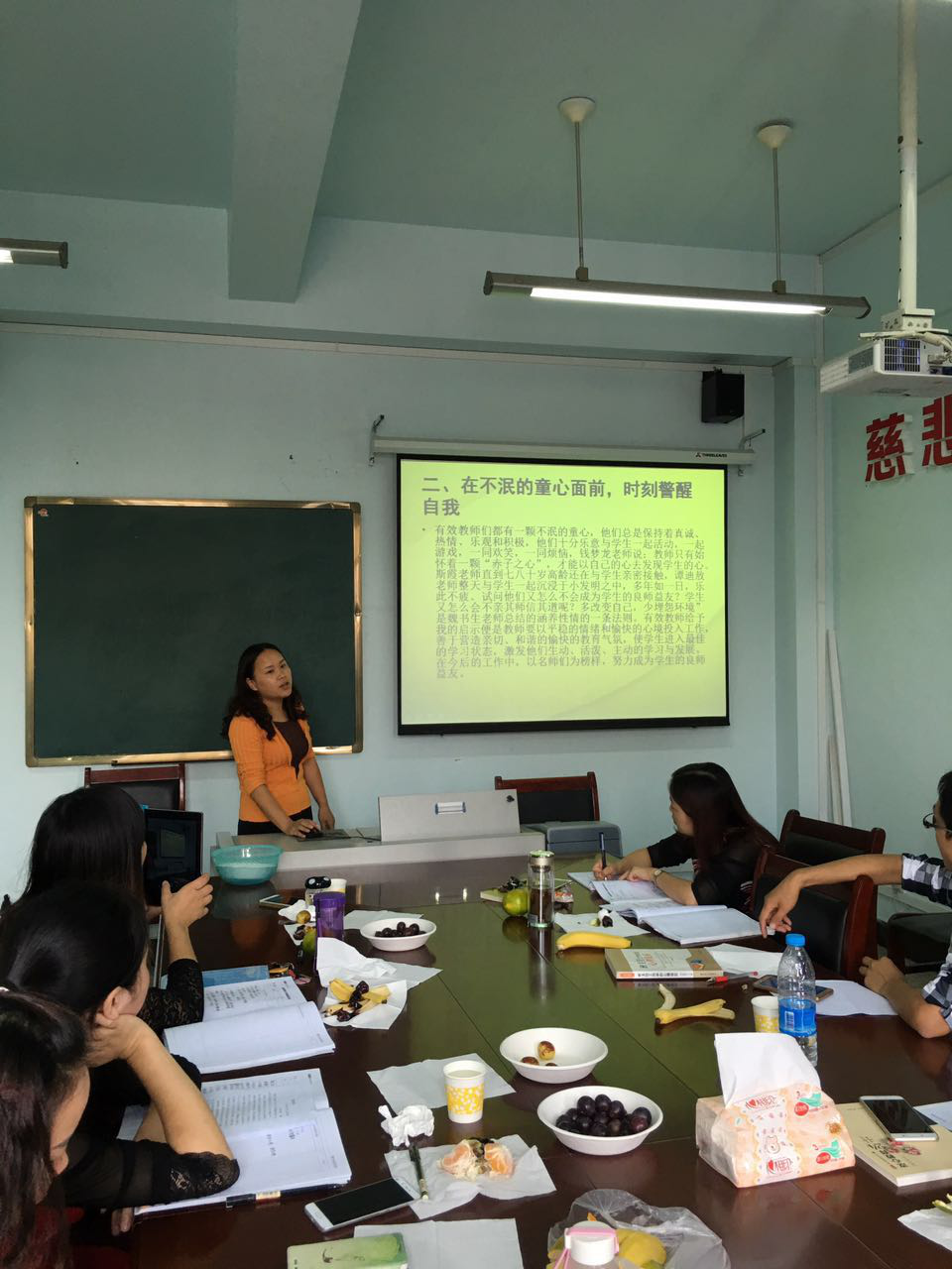 吴利琼老师以《做一名有效的教师》为主题作了专题报告,具有很强的借鉴意义。她分别从发自本心的热爱教育、不泯的童心、学生的主体地位等六大板块谈了自己的见解与收获,获得大家的一致好评。
